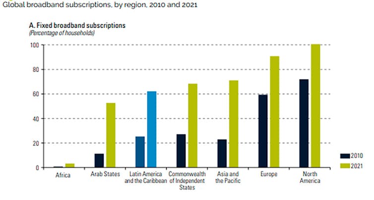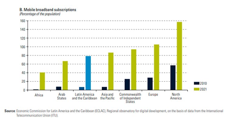 Como muestran los gráficos siguientes, extraídos del portal estadístico de CEPAL, el acceso a banda ancha fija (suscripciones por hogar) y móvil (suscripciones de personas) muestran que la mayor parte de la población latinoamericana y del Caribe tiene cierta conectividad. Más del 60 % de los hogares de la región posee conexiones de banda ancha fija, mientras que casi el 80 % de la población accede a la banda móvil a través de sus dispositivos celulares. Los gráficos también permiten ponderar el crecimiento experimentado en las diferentes regiones del planeta entre los datos de 2010 y los de 2021.