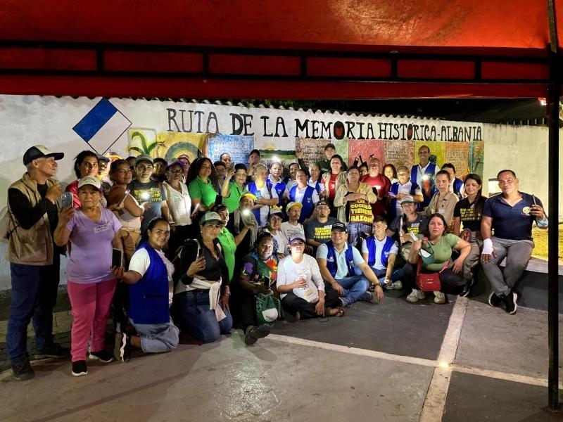 A pulso, mujeres, hombres y jóvenes dieron vida al mural que en 16 escenas recrea la Ruta de la Memoria Histórica del municipio de Albania. Cada trazo es una vivencia, un hecho, un relato marcado por el dolor y los sueños. Huellas del conflicto y la dignidad de las víctimas para aferrarse al amor, la vida, el futuro. Junto a este mural también tres macetas narran el significado de ser niña, mujer adulta y abuela víctimas del conflicto armado, legados que hacen pedagogía desde el arte para exigir nunca más la guerra, nunca más la muerte y el miedo en el verde territorio de Albania.